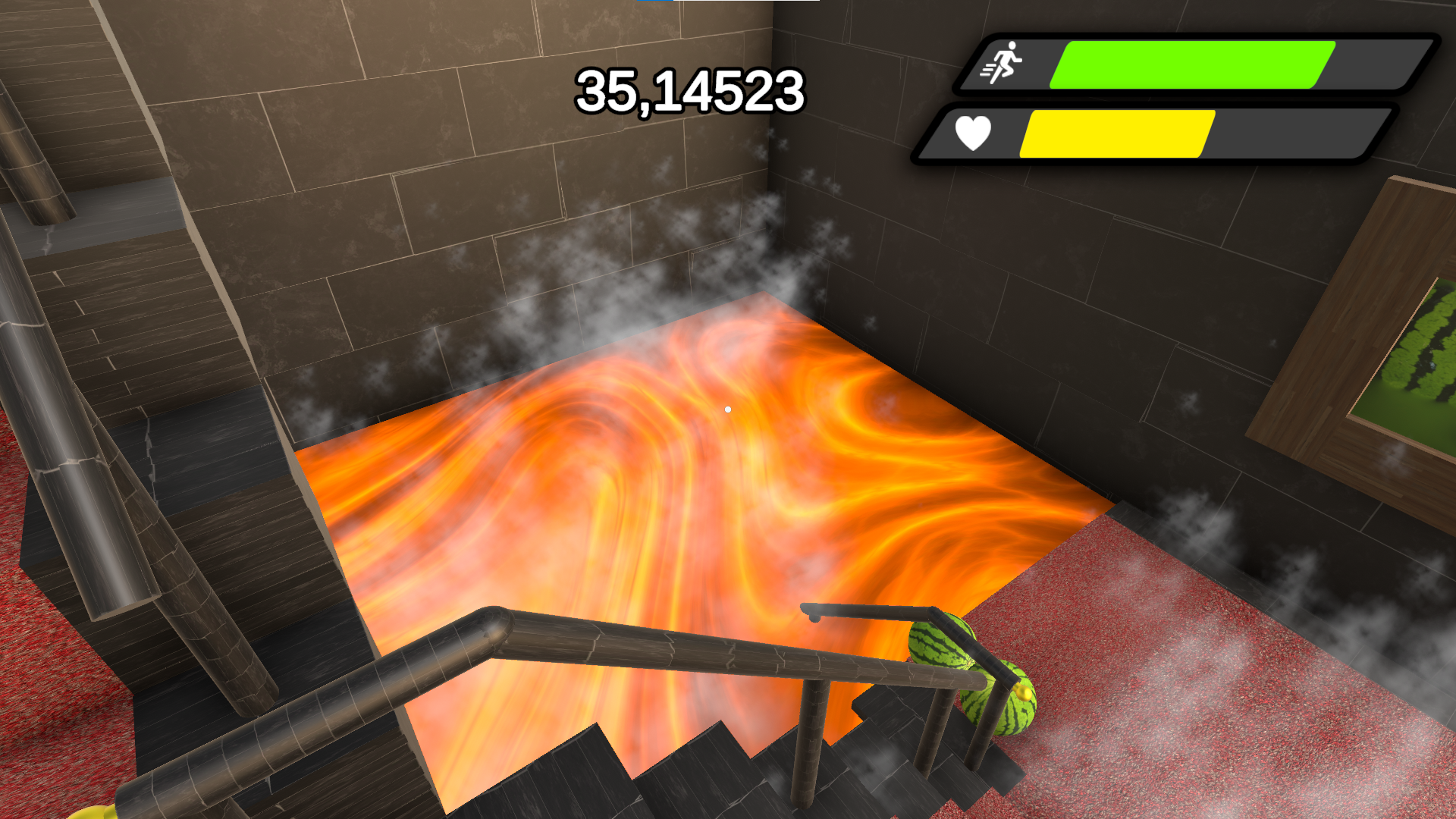 Collect watermelons that give you stamina so you can run away from the lava and get the highest score! In addition, along the way you will find benches that will help you rest in dangerous situations...